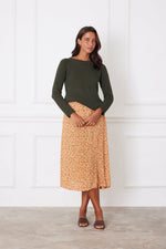 Introducing the Avery Skirt. This flowing, A-line midi length skirt is sure to become a conscious closet staple. Made from a luxurious deadstock viscose fabric in a beautiful ditsy floral pattern, the Avery skirt will have you feeling stylish in the most effortless way. Featuring a subtle slit on the front left side and an elastic back waistband for ease and comfort. Now true to size for the perfect fit.