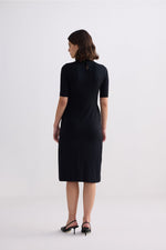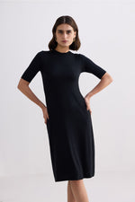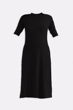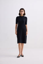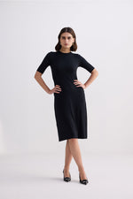 High Crew Neck Elbow Sleeves Fitted Dress in Black