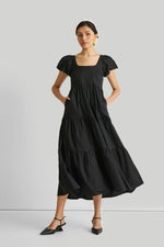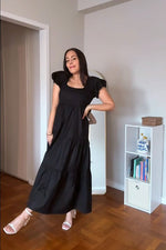 A dreamy black maxi dress layered with delicate tiers. The flowing silhouette and tiered design offer a flattering fit and comfortable wear. Its chic puff sleeves and back tie add a touch of drama to this effortlessly comfy outfit.