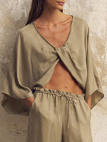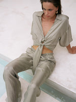 The Perfect Match. Designed to pair flawlessly with our Lucid Flow Pants, the Lucid Tie Shirt is a versatile staple in its own right. Crafted from the same premium Tencel blend, it features a relaxed silhouette with wide sleeves and a front tie closure. Wear it tied tight as a chic crop top, or leave it loose over a swimsuit for a luxurious cover-up.