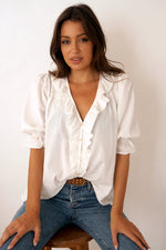 Discover the Chloe Shirt, ethically crafted from sustainable soft cotton swiss dot fabric. This voluminous blouse features feminine details — a delicate ruffle neckline, real shell buttons, and petit pin-tucks — blending comfort with considered design. A versatile staple, she moves seamlessly from day to night, every day of the year.