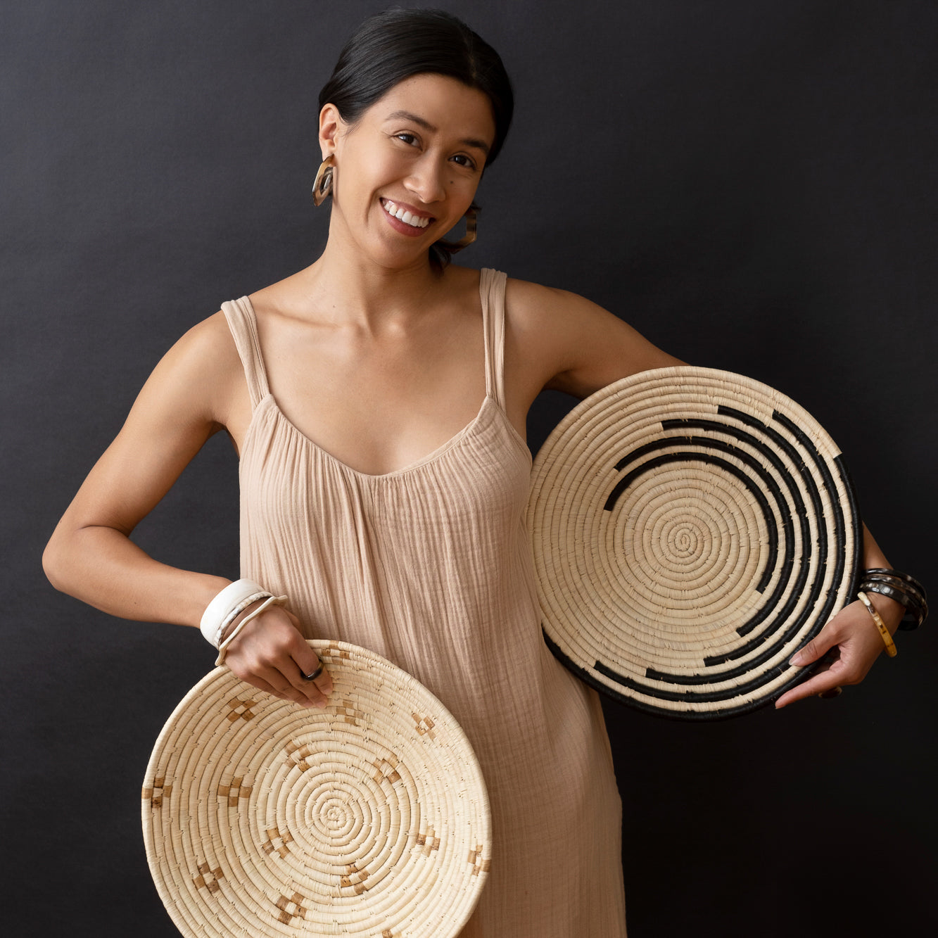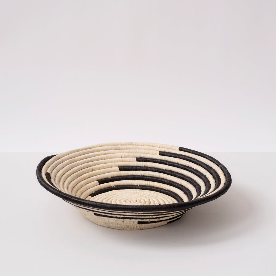 Make a wall statement with a stunning collection of baskets on display or elevate your tablescape with a unique centerpiece. A simple yet bold basket from our Black & Natural collection. Handcrafted by women artisans living in Central Uganda who are part of a cooperative that provides employment and training for disadvantaged or marginalized communities - particularly widows, the disabled and those living with HIV/AIDS. Made from all natural, sustainably sourced raffia and banana fibers All synthetic AZO free dyes Hanging loop on back allows basket to be wall decor in addition to tabletop use Weavers hand make each basket from home while tending to other household duties. Baskets can take days to weeks to complete with artists weaving 3 or so hours per day while balancing other responsibilities. No two baskets are identical - there will be slight variations in size and color from the one shown due to the handmade nature of each product. Each basket is both special and unique. HANDMADE IN UGANDA APPROXIMATE SIZE: 13" x 3.5"