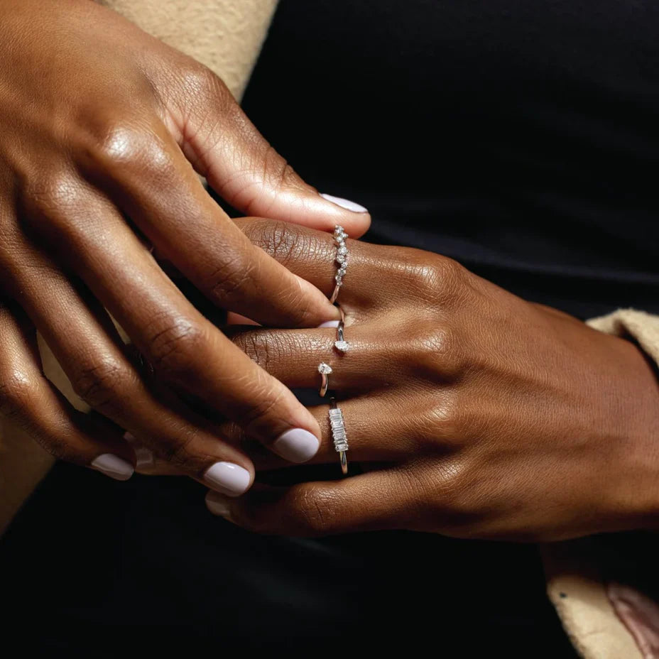 The Élise Lumière Ring is crafted to capture light with effortless grace, a delicate row of round lab-grown diamonds set in warm 14K yellow gold. Elegant on its own, irresistible when stacked.