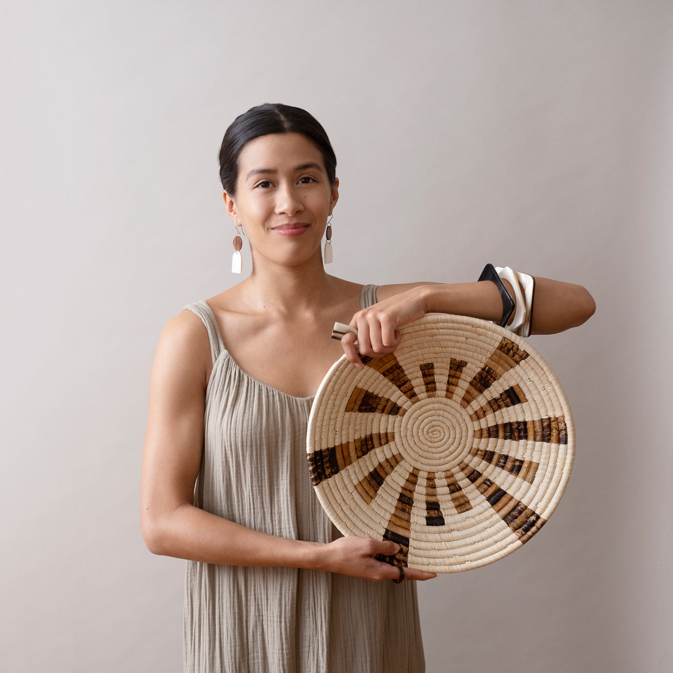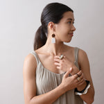 Crafted in a contemporary design of hand carved, upcycled white and brown horn, the Embody Earrings are lightweight and serene. Perfect for anyday, these earrings embody an easy combination of both simplicity and sophistication. Sustainably sourced horn from rural Ugandan cattle keepers, horn is used and upcycled instead of wasted Hand carved in small scale, Fair Trade artisan cooperative in Uganda High variability of horn color ensures that no two pieces are the same Jewelry pieces come in variable shades of white to brown to black 14K gold plated findings and stainless steel posts crafted by Fair Trade verified program to provide employment and training to formerly trafficked women Skillfully assembled in Uganda with love and care HANDMADE IN UGANDA APPROXIMATE SIZE: 2.5"