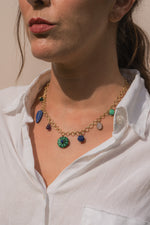 - Multi-charm necklace with malachite, morganite, amethyst, green onyx and lapis lazuli. Handmade chain with lobster clasp fastening.