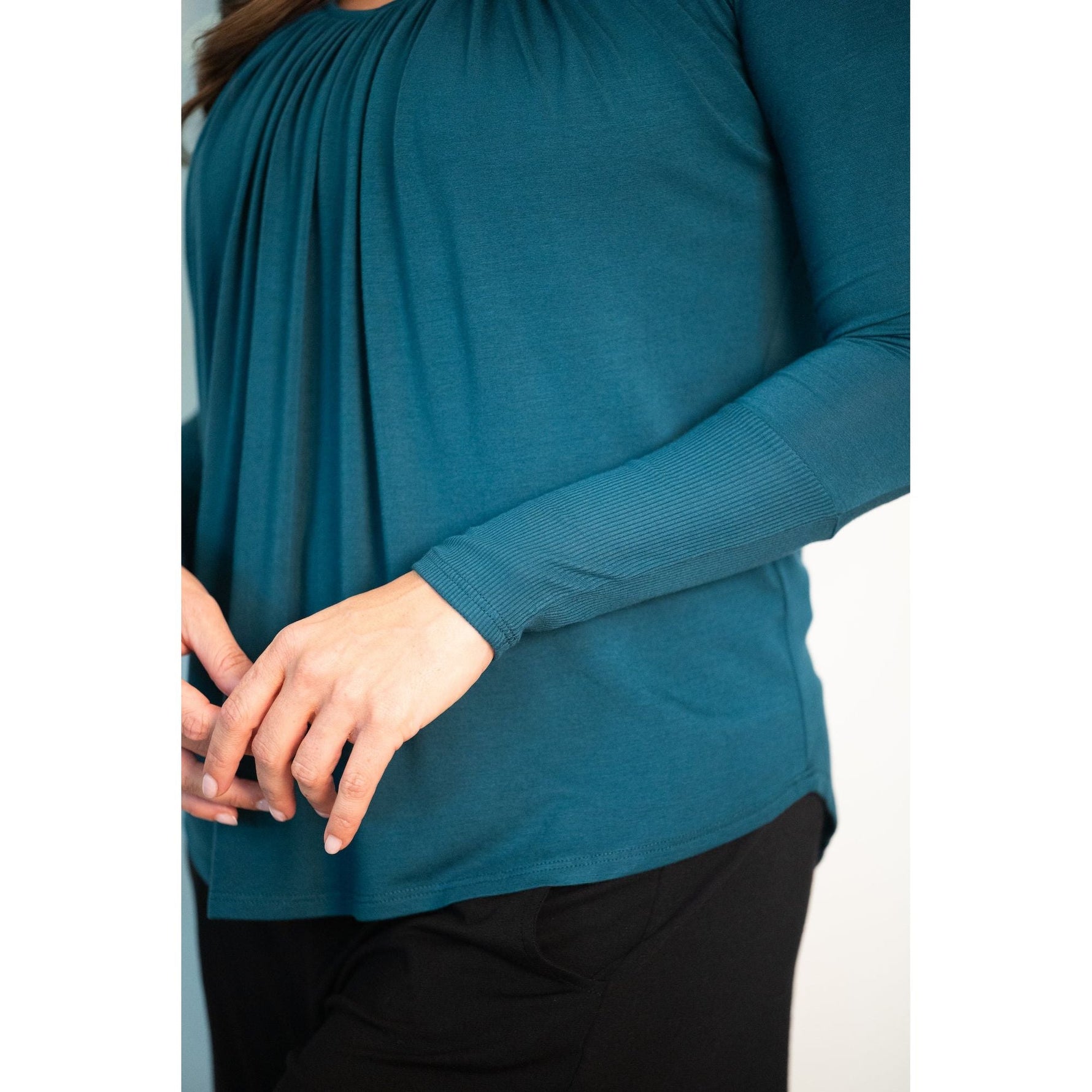 Made from an ultra-soft Modal/Spandex blend, the Full Moon Top moves with you and feels breathable against skin. Thoughtful details like front shirring and ribbed cuffs give this everyday essential a chic, finished look.