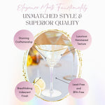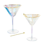 - Set includes 2 iridescent gold-rimmed martini glasses + 2 stainless steel gold cocktail picks in a luxury gift box