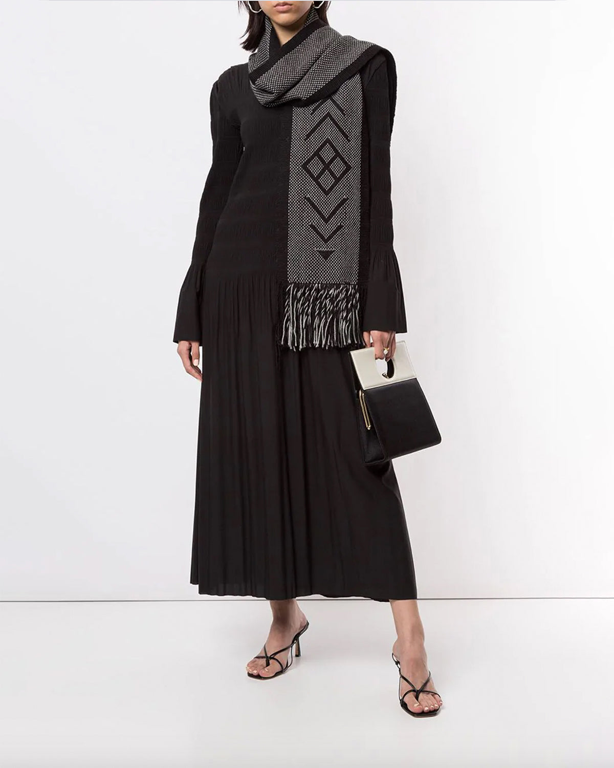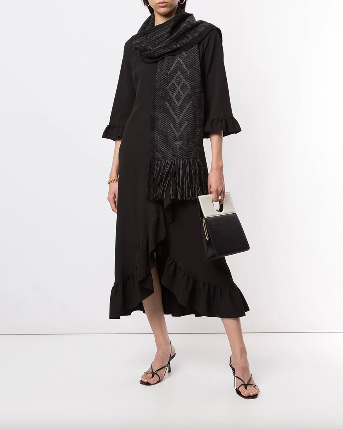 The Mapu Scarf features the Che Symbol which in Mapuche culture, representing the cosmos, alongside playful fringe.