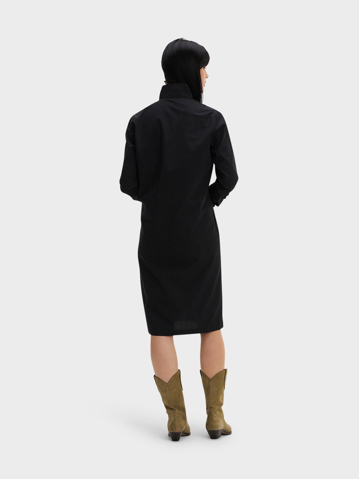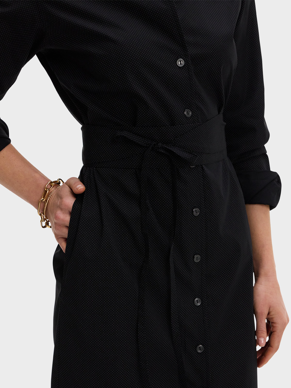 Our one and done Shirt Dress featuring our Signature collar in a black with white pin-dot broadcloth.