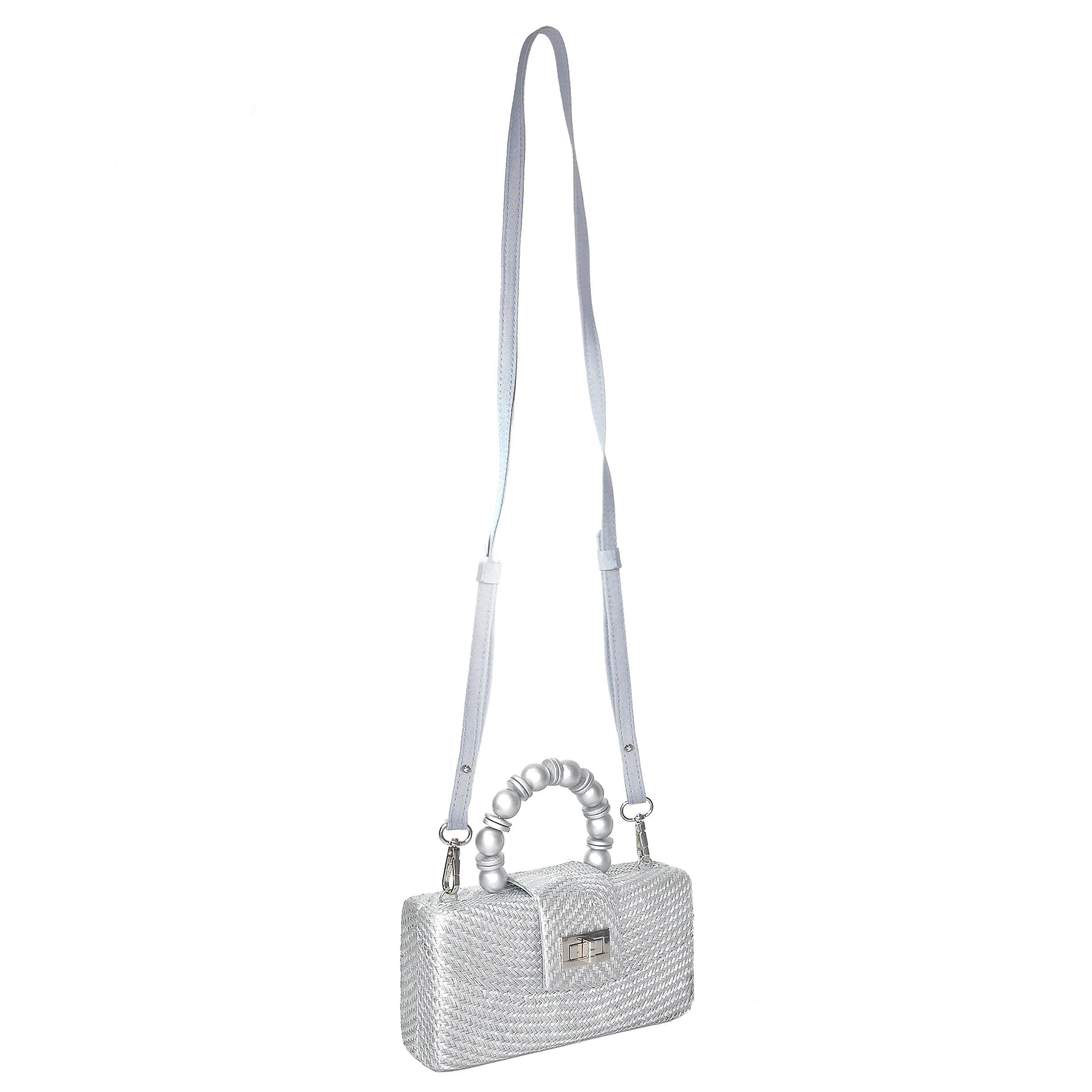 Unit price perMake a statement this holiday season with our stunning silver buntal straw clutch. Handcrafted by skilled Filipino artisans, this exquisite evening bag features intricate buntal straw weaving in a stunning silver tone that catches the light beautifully. The show-stopping handle combines silver wooden beads in both round and rondelle shapes, creating a luxurious focal point that elevates any outfit. Perfect for Christmas parties, New Year's Eve celebrations, or any special occasion where you want to shine. The compact rectangular silhouette holds all your essentials while the secure silver-toned clasp keeps everything safe as you dance the night away. Each clutch is woven from buntal straw, a sustainable fiber from indigenous Philippine palm trees, making this not just a beautiful accessory but a conscious choice that supports traditional craftsmanship and artisan communities. Details: Handwoven buntal straw in silver Silver wooden bead handle with round and rondelle shapes Dimensions: 8" W x 4" H x 2.2" D Total height with handle: 7.5" Silver-toned hardware closure Includes protective dust bag Sunshine in every detail.